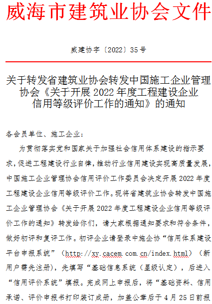 關(guān)于轉(zhuǎn)發(fā)省建筑業(yè)協(xié)會轉(zhuǎn)發(fā)中國施工企業(yè)管理協(xié)會《關(guān)于開展2022年度工程建設(shè)企業(yè)信用等級評價(jià)工作的通知》的通知