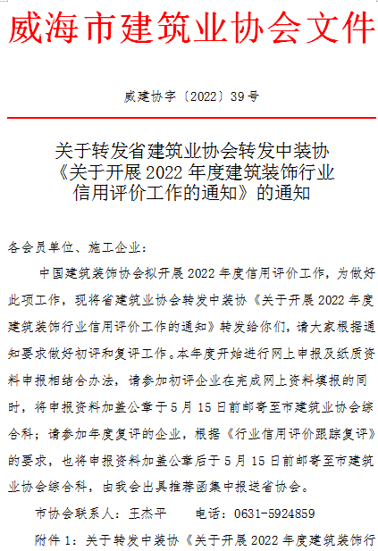 附件1:關于轉(zhuǎn)發(fā)中裝協(xié)《關于開展2022年度建筑裝飾行業(yè)信用評價工作的通知》的通知.pdf