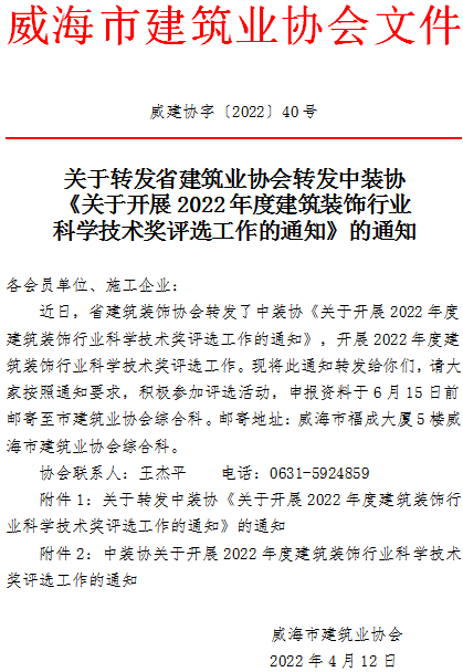 關(guān)于轉(zhuǎn)發(fā)省建筑業(yè)協(xié)會轉(zhuǎn)發(fā)中裝協(xié)《關(guān)于開展2022年度建筑裝飾行業(yè)科學(xué)技術(shù)獎評選工作的通知》的通知