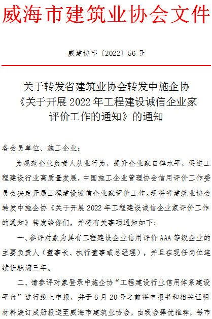 關(guān)于轉(zhuǎn)發(fā)省建筑業(yè)協(xié)會轉(zhuǎn)發(fā)中施企協(xié)《關(guān)于開展2022年工程建設(shè)誠信企業(yè)家評價工作的通知》的通知