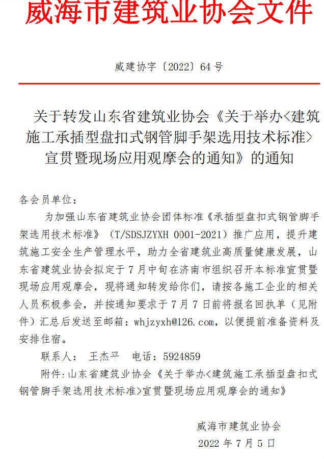 >關于轉發(fā)山東省建筑業(yè)協(xié)會《關于舉辦<建筑施工承插型盤扣式鋼管腳手架選用技術標準>宣貫暨現(xiàn)場應用觀摩會的通知》的通知