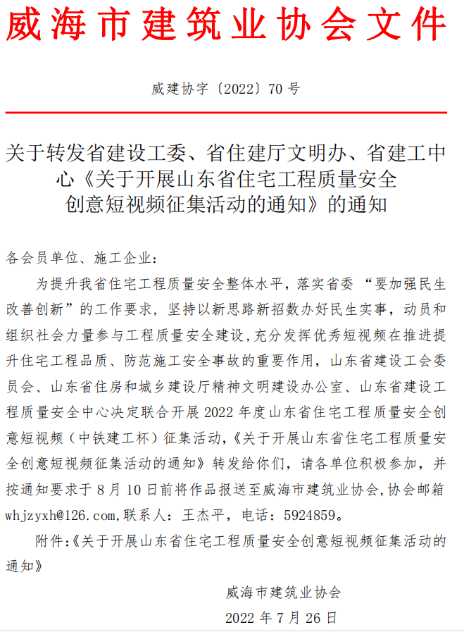 關(guān)于轉(zhuǎn)發(fā)省建設(shè)工委、省住建廳文明辦、省建工中心《關(guān)于開展山東省住宅工程質(zhì)量安全 創(chuàng)意短視頻征集活動(dòng)的通知》的通知