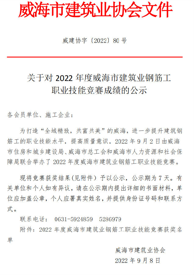 >關(guān)于對(duì)2022年度威海市建筑業(yè)鋼筋工 職業(yè)技能競(jìng)賽成績(jī)的公示