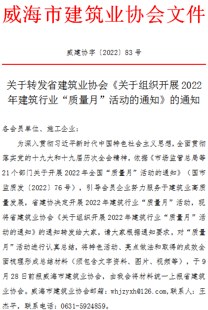 關(guān)于轉(zhuǎn)發(fā)省建筑業(yè)協(xié)會(huì)《關(guān)于組織開展2022年建筑行業(yè)“質(zhì)量月”活動(dòng)的通知》的通知