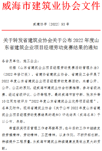 >關(guān)于轉(zhuǎn)發(fā)省建筑業(yè)協(xié)會關(guān)于公布2022年度山東省建筑企業(yè)項目經(jīng)理勞動競賽結(jié)果的通知