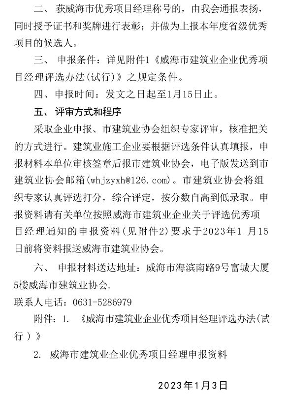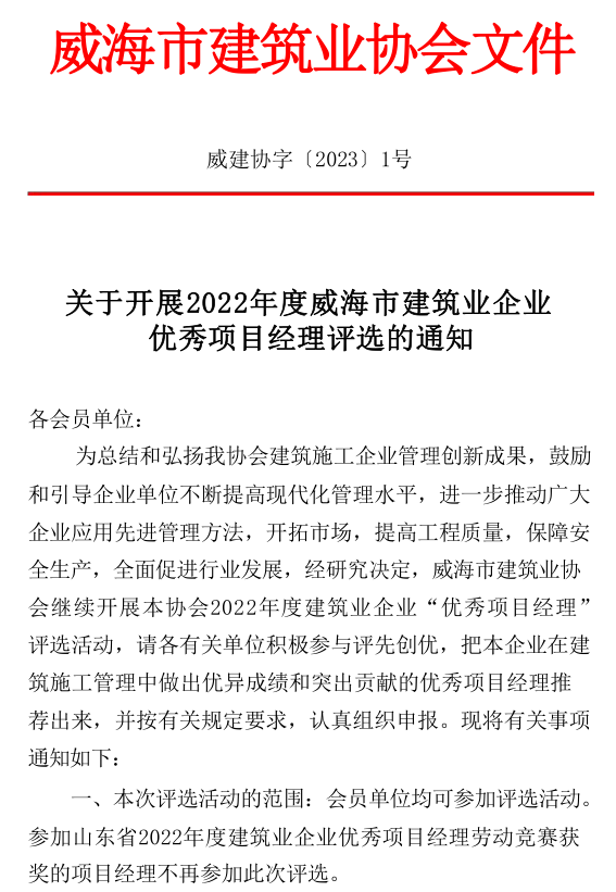 關(guān)于開展2022年度威海市建筑業(yè)企業(yè)優(yōu)秀項目經(jīng)理評選的通知