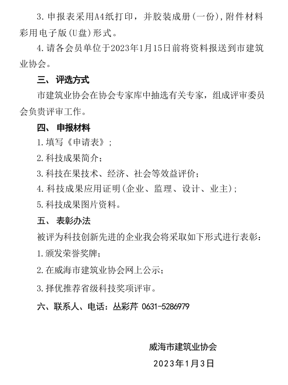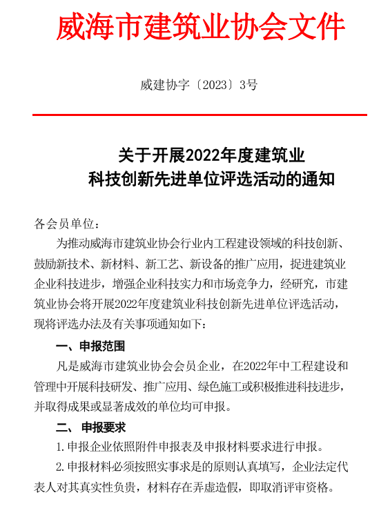 威海市建筑業(yè)協(xié)會關于評選 2022年度威海市建筑業(yè)先進單位的通知