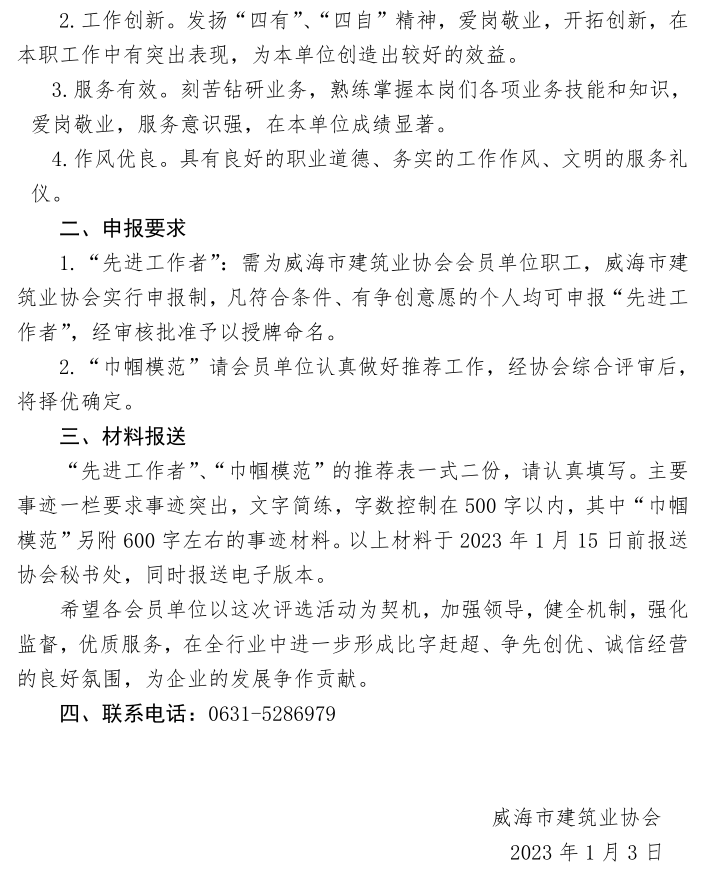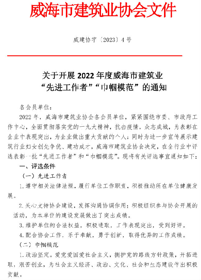 關于開展2022年度威海市建筑業(yè) “先進工作者”“巾幗模范”的通知