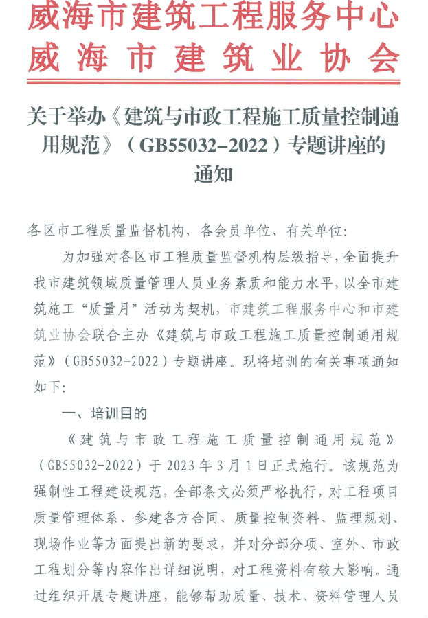 >關(guān)于舉辦《建筑與市政工程施工質(zhì)量控制通用規(guī)范》(GB55032-2022)專題講座的 通知