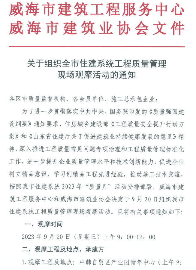 >關(guān)于組織全市住建系統(tǒng)工程質(zhì)量管理現(xiàn)場(chǎng)觀摩活動(dòng)的通知