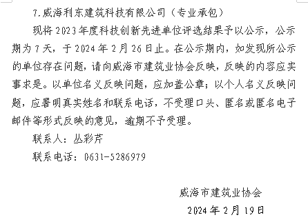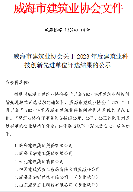 威建協(xié)字2024年10號威海市建筑業(yè)協(xié)會關(guān)于對2023年度威海市建筑業(yè)科技創(chuàng)新先進(jìn)單位評選結(jié)果的公示