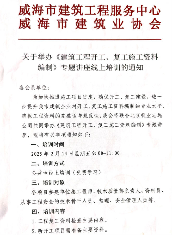 >關(guān)于舉辦《建筑工程開(kāi)工、復(fù)工施工資料編制》專題講座線上培訓(xùn)的通知