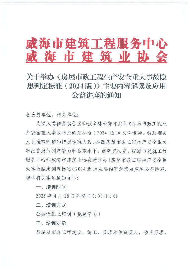 >關(guān)于舉辦《房屋市政工程生產(chǎn)安全重大事故隱患判定標(biāo)準(zhǔn)(2024版)》主要內(nèi)容解讀及應(yīng)用公益講座的通知